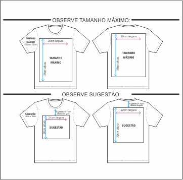 Dimensão Máxima da arte: Tam. 29cm x 38cm - respeitando o tamanho de camiseta escolhida.